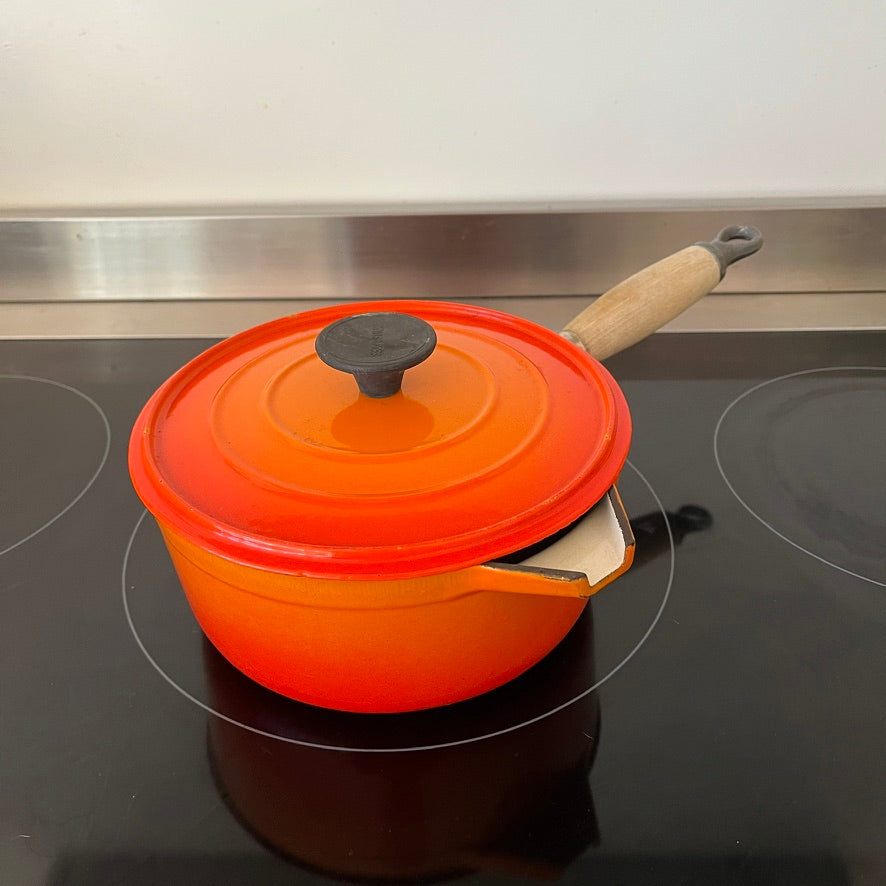 Vintage Cousances (is Le Creuset) gietijzeren steelpan met deksel (heeft wat schilfertjes). De pan heeft een diameter van 18 cm en is gebruikt, met aanslag op de bodem. Ideaal voor het verwarmen van melk, sauzen en andere kleine hoeveelheden.