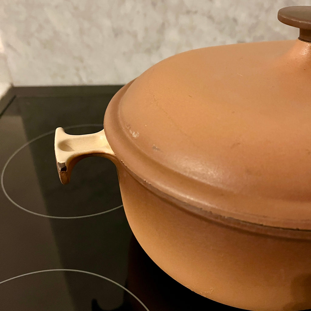 Vintage Le Creuset braadpan braadpan ontworpen door Enzo Mari in de jaren zestig. De pan heeft een diameter van 25 cm en is geschikt voor ieder fornuis (ook inductie) en de oven. De pan verkeert in goede staat, maar met wat kleine schilfertjes aan de rand. Zie foto's voor details.