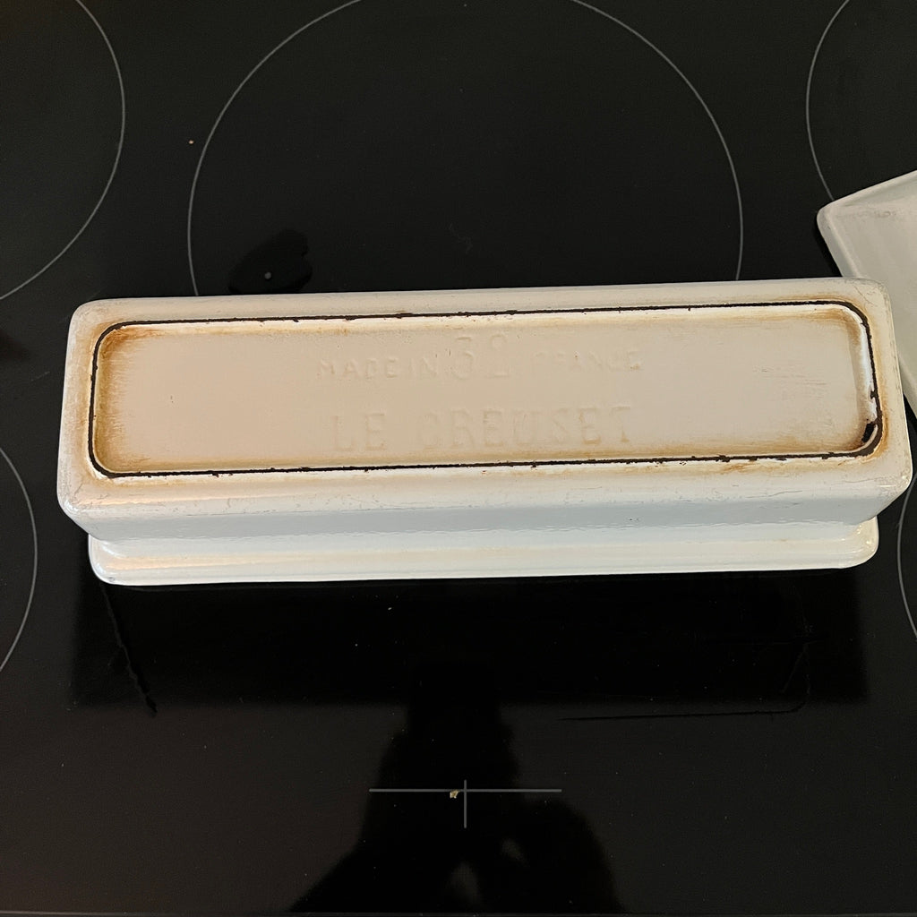 Prachtige vintage Le Creuset patévorm, perfect voor het bereiden van heerlijke patés en terrines. Deze vorm is uitgevoerd in wit geëmailleerd gietijzer, wat zorgt voor een uitstekende en gelijkmatige warmteverdeling tijdens het koken. De lengte van de vorm is 32 cm. Zoals te zien is op de foto's, vertoont de vorm lichte beschadigingen aan de handgreep