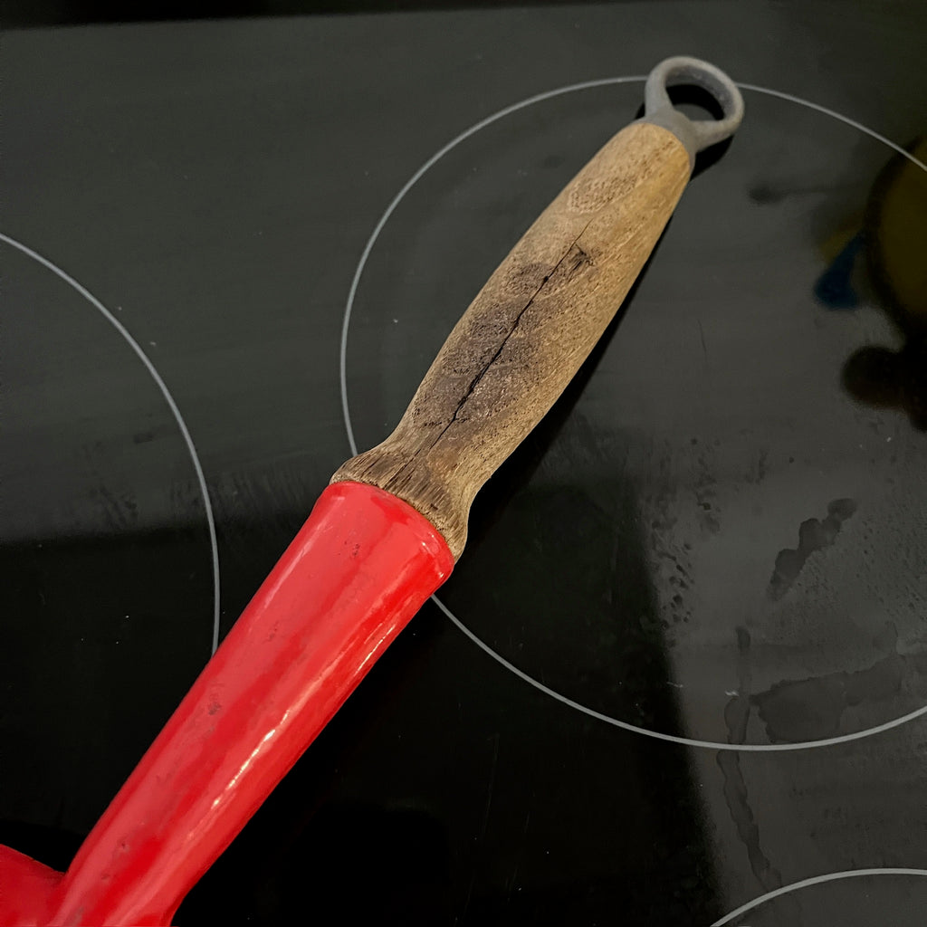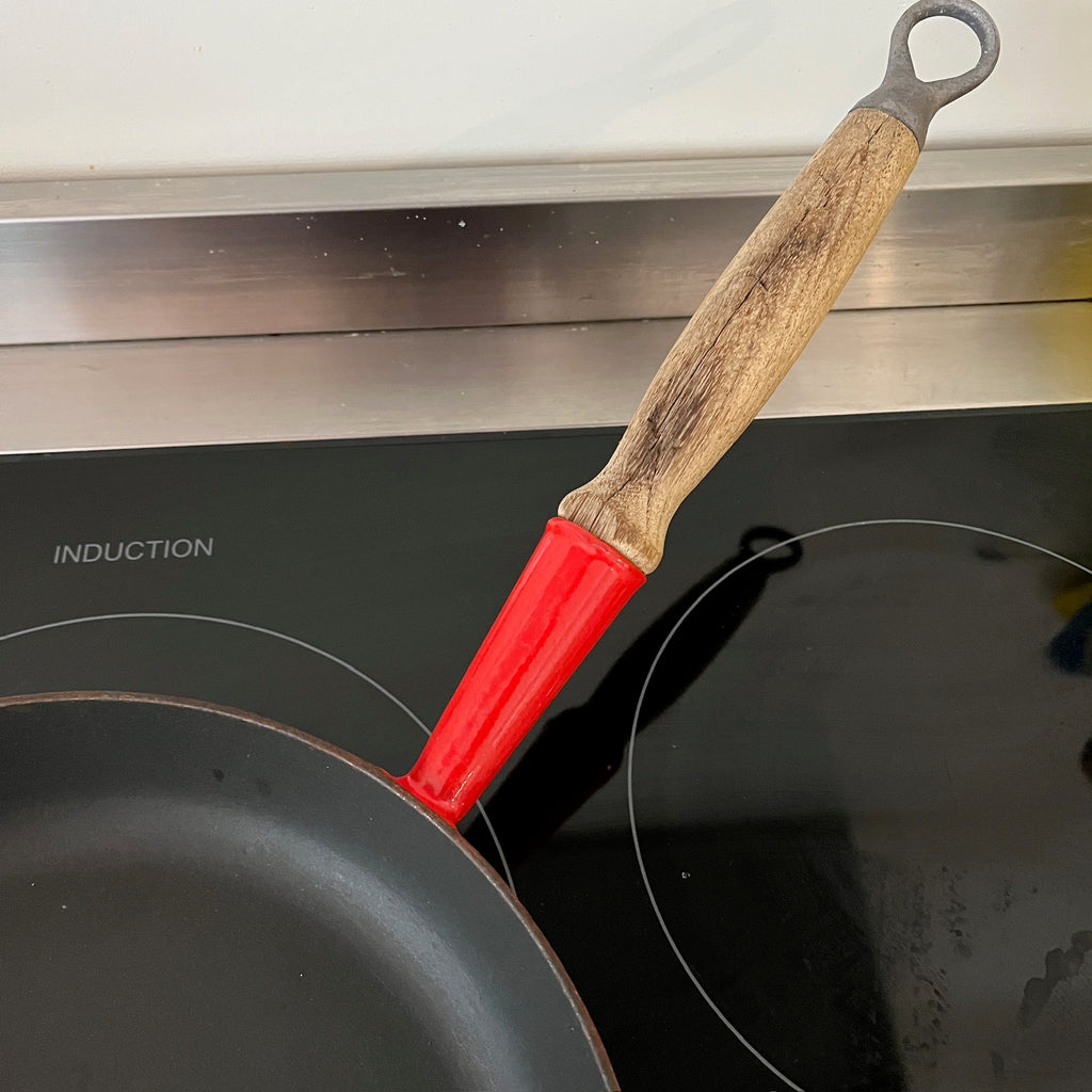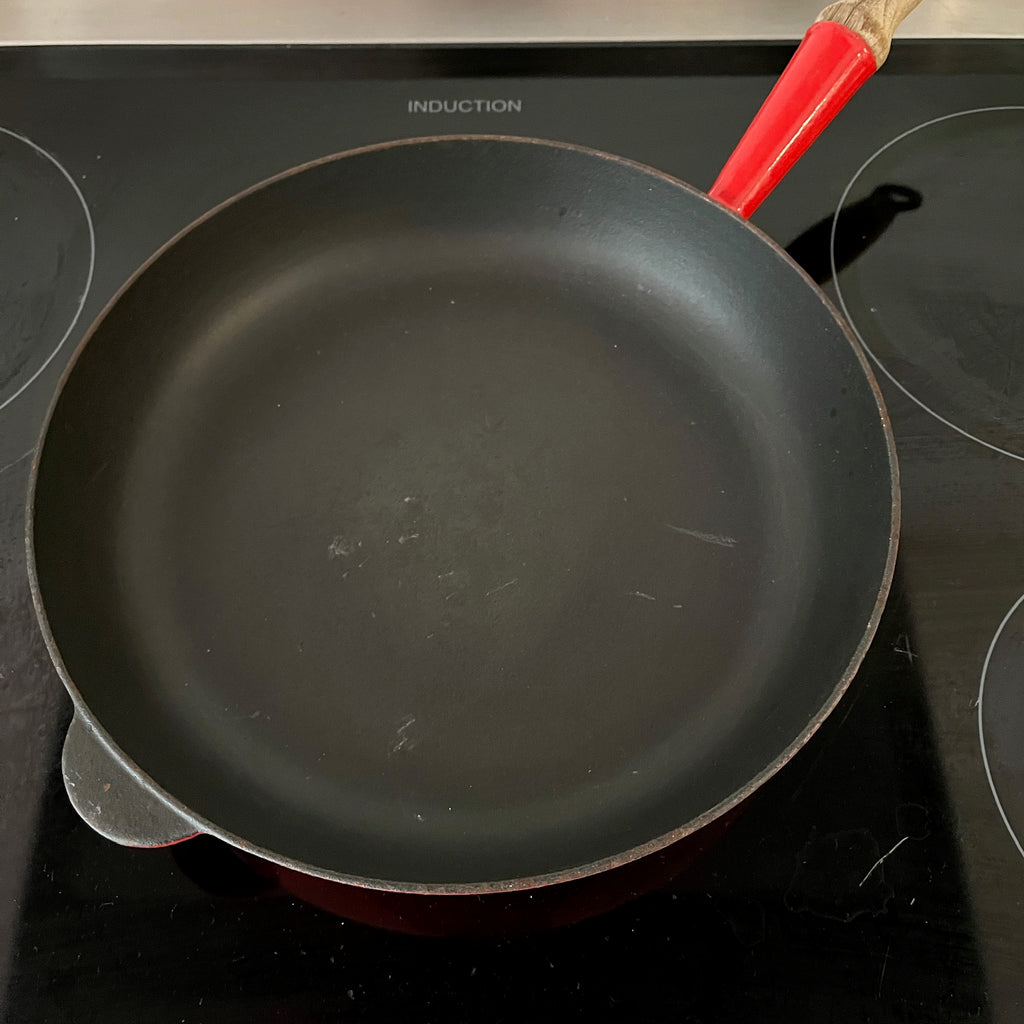 Vintage Cousances (nu Le Creuset) bakpan, gemaakt van geëmailleerd gietijzer en anti aanbaklaag. De pan heeft een diameter van 28 cm en is voorzien van een houten handgreep en geschikt voor ieder fornuis inclusief inductie.De pan verkeert in goede staat, met gebruikssporen passend bij de leeftijd. Bekijk de foto's voor een goede indruk van de conditie.