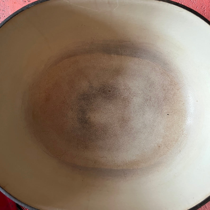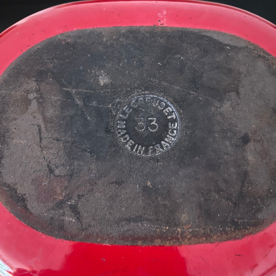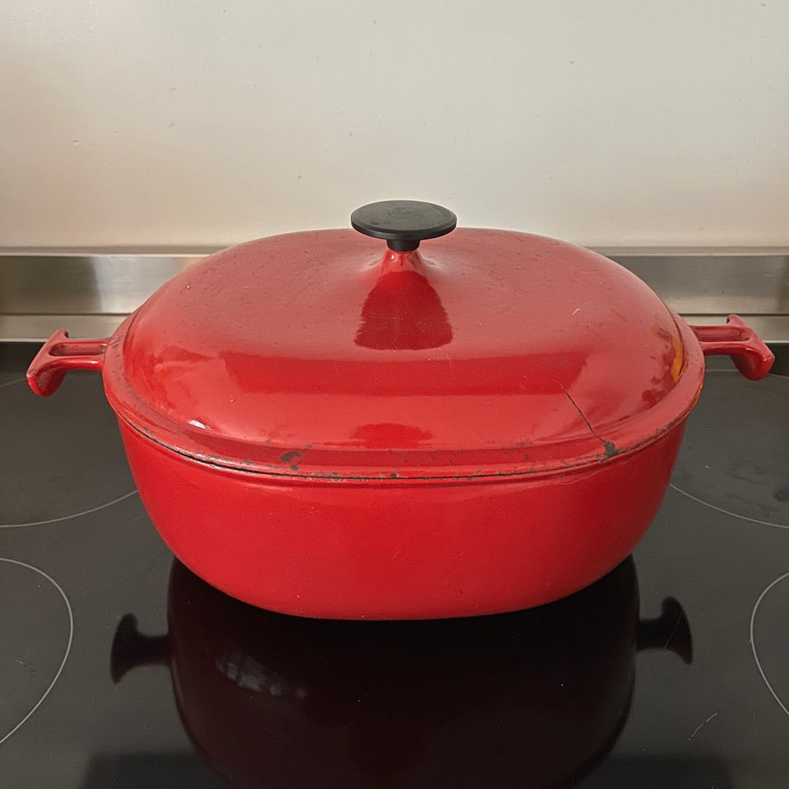 Grote Le Creuset braadpan (33 cm), een iconisch ontwerp uit de jaren zestig van Enzo Mari, bekend als 'La Mama'. Deze rode braadpan is geschikt voor alle warmtebronnen, inclusief inductie en oven. De pan vertoont lichte aanslag op de bodem en de deksel heeft twee haarscheurtjes.